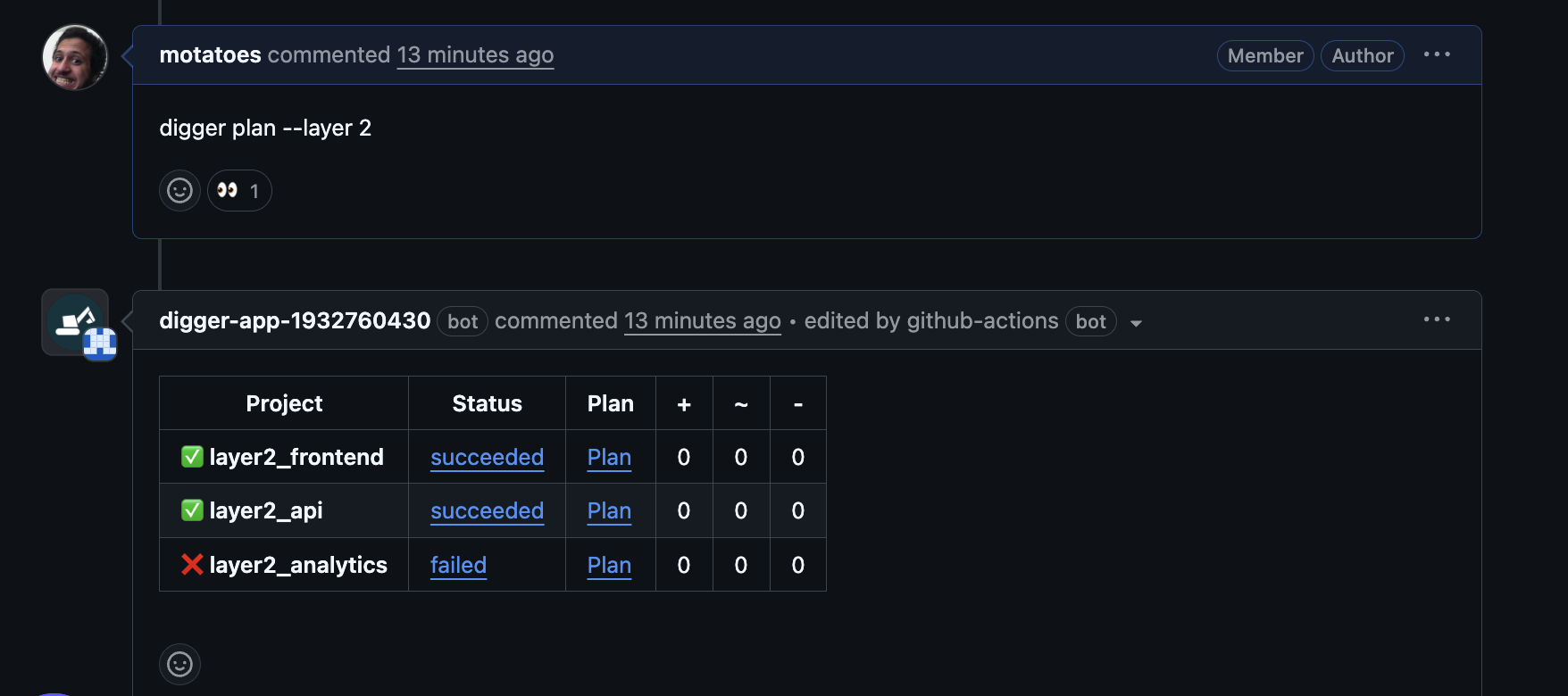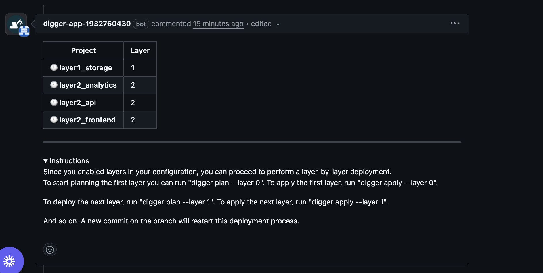With layering enabled when you open a PR touching a module, digger will first display all impacted projects and the layers, it will then guide you on the next commands to start planning and applying the layers in the right order