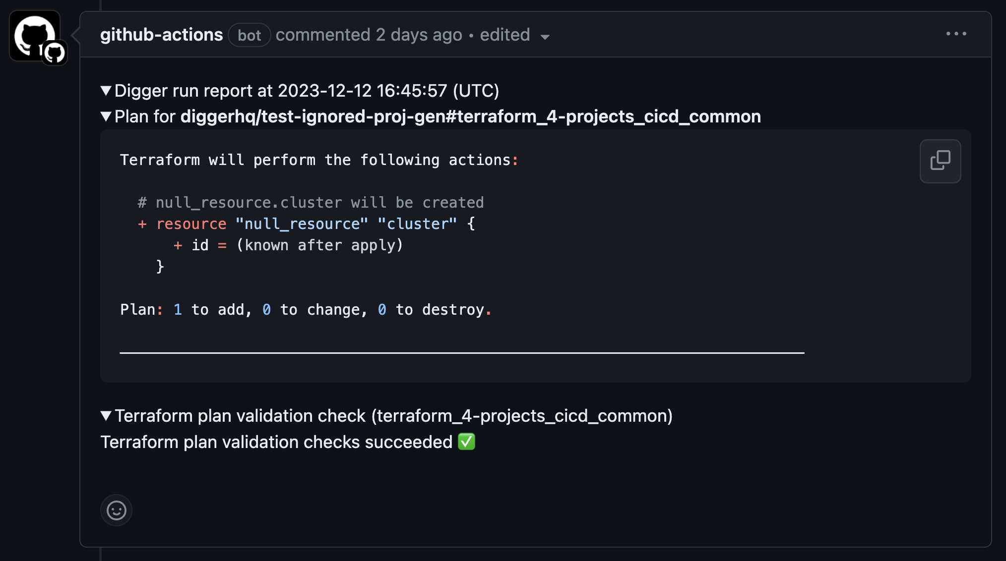 Digger runs terraform plan whenever a pull request is raised, and appends output as comment Digger run report also contains other useful info e.g. results of policy checks. You can also re-plan by commenting digger plan (see CommentOps)